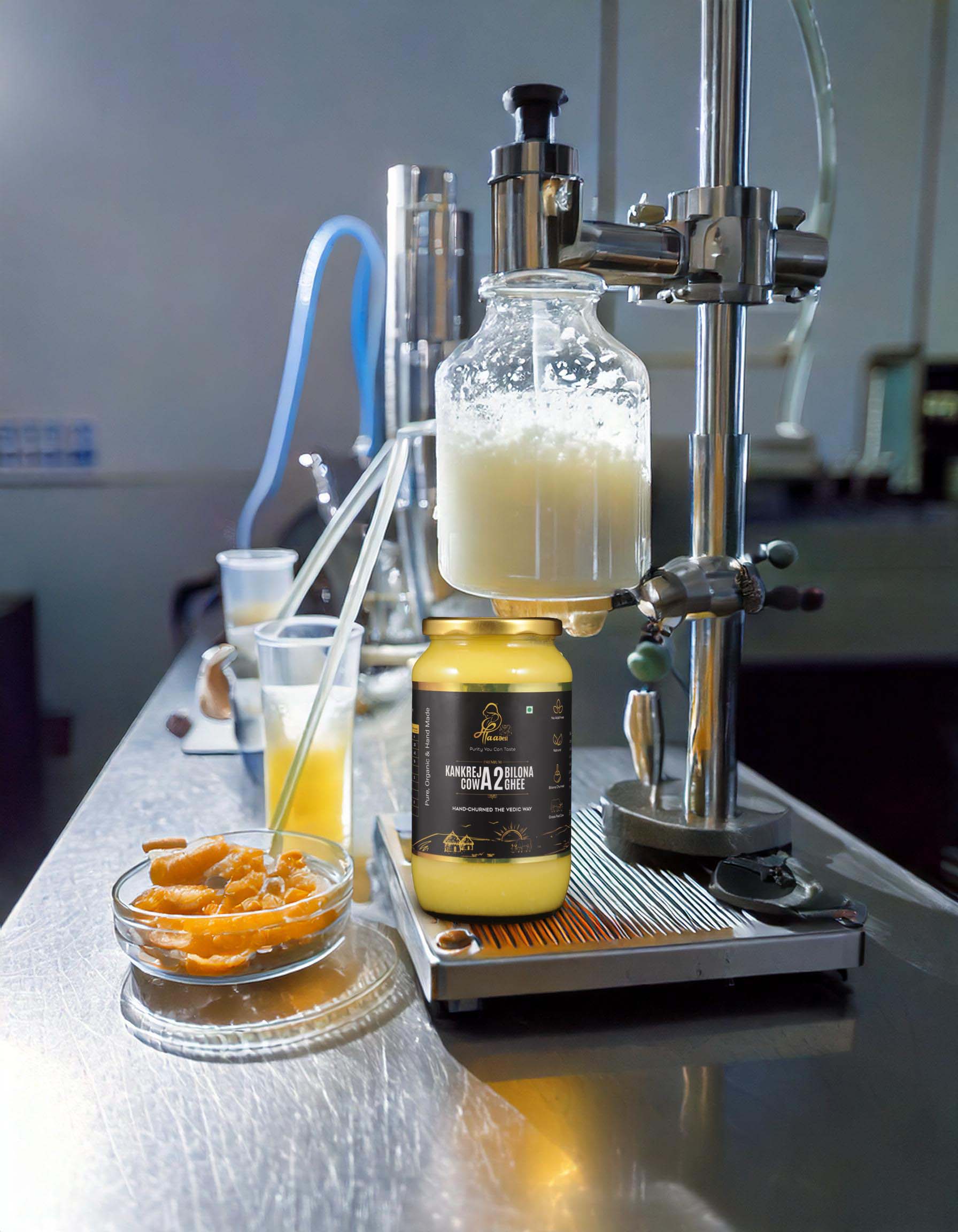 Our A2 cow ghee is made using the traditional bilona method from the milk of Kutchi Kankrej desi cows. This process ensures purity and enhances the nutritional value, promoting better digestion and overall health.